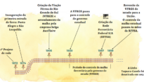 Infográfico com as linhas tronco e principais ramais da malha histórica ferroviária do Rio Grande do Sul e Linha do Tempo com marcos históricos (transição privado para público).