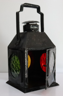Lanterna estilo semáforo (usando vidros com as cores amarela, branca, vermelha e verde) utilizada para sinalização manual na linha férrea, a fim de garantir a segurança e eficiência do movimento de composições e veículos ferroviários.