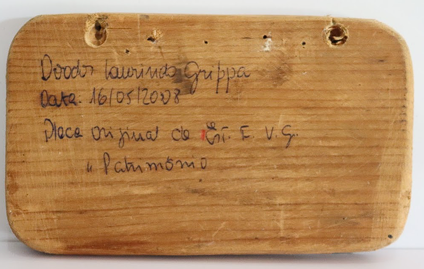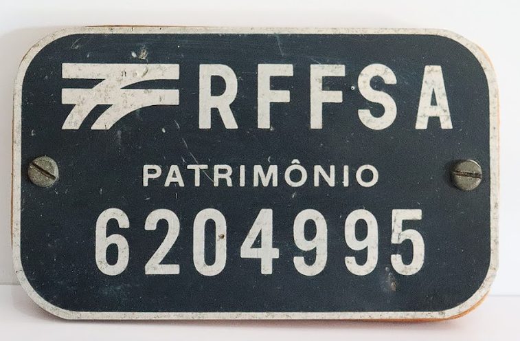 Placa de identificação de bem patrimonial, em madeira, utilizada pela Rede Ferroviária Federal S/A (RFFSA). A RFFSA encampou, a partir de 1959, a rede ferroviária do Rio Grande do Sul, que estava sob administração do governo do estado desde 1920, sob a empresa Viação Férrea do Rio Grande do Sul (VFRGS),