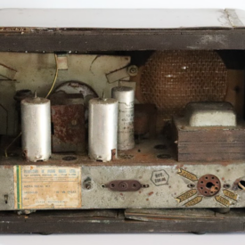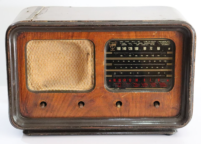 Aparelho para recepção de sinais radiofônicos de estações transmissoras. Funcionamento baseado em válvulas eletrônicas (componentes eletrônicos precursores dos transístores). Marca não identificada. Recepção em AM (Amplitude Modulada).